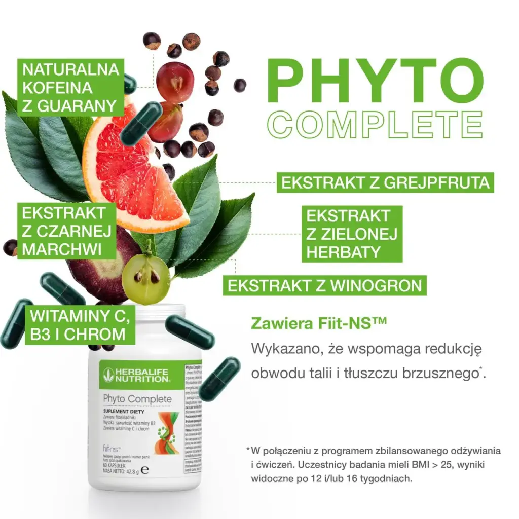 - Wsparcie w redukcji tkanki tłuszczowej. Badania naukowe wykazały, że Herbalife Phyto Complete z Fiit-NS™ wspomaga redukcję obwodu talii i tłuszczu brzusznego. Składniki zawarte w Phyto Complete pomagają w procesie spalania tłuszczu, co może być szczególnie korzystne w procesie odchudzania.